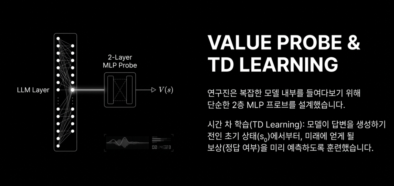 - 가치 프로브(value probe): 각 레이어의 히든 스테이트를 입력으로 받아, 최종 보상(reward)을 예측하는 작은 MLP