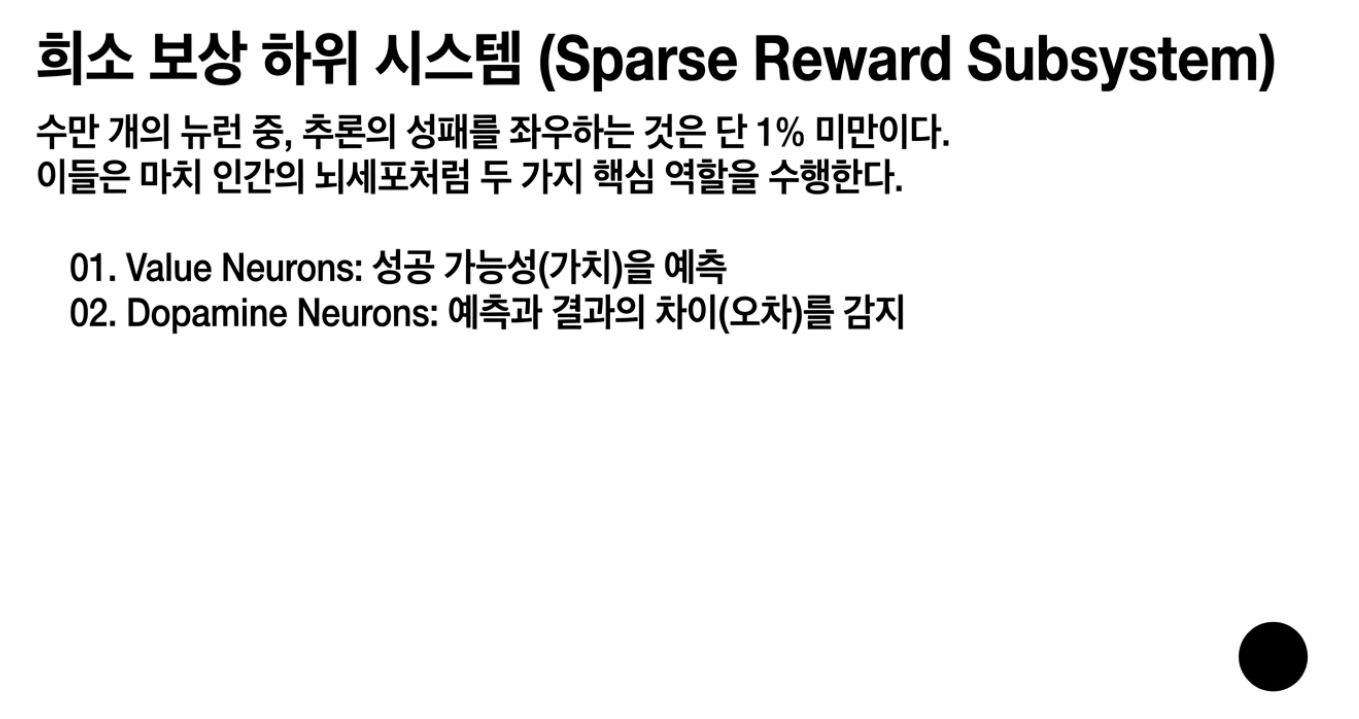 다만 이걸 “1%가 범용 지능의 코어다”라고 해석하기엔 섣부를 수 있습니다. 이 논문이 직접 다루는 보상은 주로 정답/오답이고, ‘뉴런’도 생물학적 실체가 아니라 히든 벡터 차원입니다. 그러므로 더 안전한 결론은, 이것이 내적 평가/비판 회로의 단서에 가깝다는 것입니다.